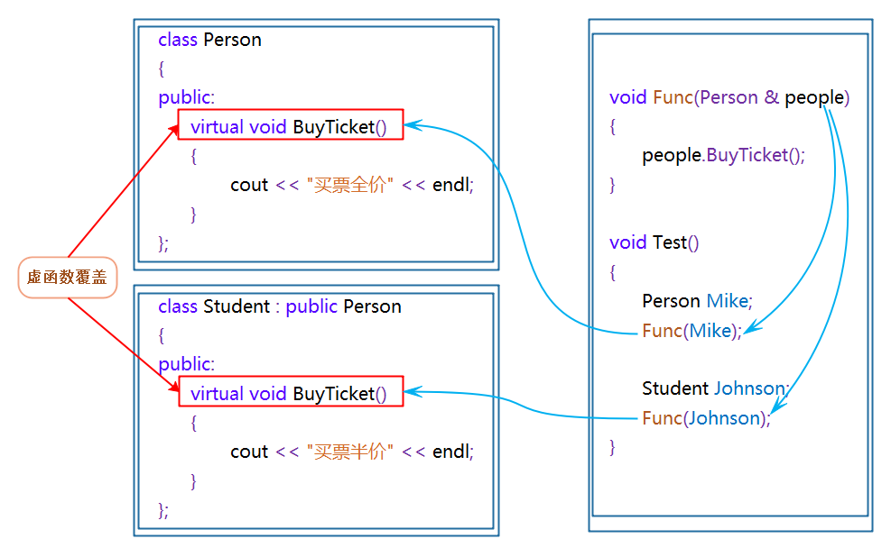 virtual void BuyTicket() { cout << "买票-全价" << endl; }};class Student : public Person {