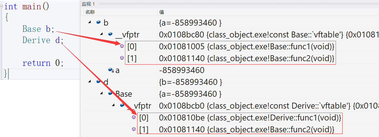 2. 基类b对象和派生类d对象虚表是不一样的,这里我们发现Func1完成了重写,所以d的虚表