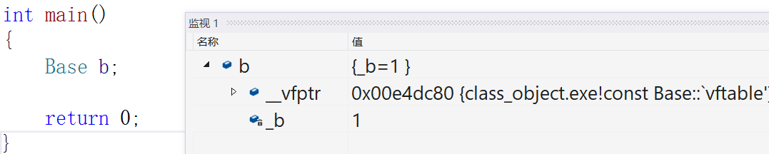 // 2.再解引用取值,就取到了b对象头4bytes的值,这个值就是指向虚表的指针