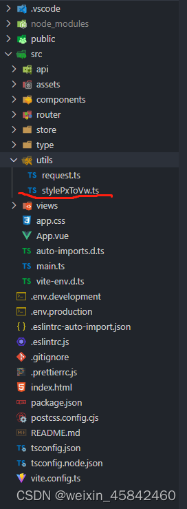 // 默认参数 let defaultsProp = {unitToConvert: "px",//需要转换的单位viewportWidth: 1920,//设计稿的宽度unitPrecision: 5,//转换单位的小数位数viewportUnit: "vw",fontViewportUnit: "vw",minPixelValue: 1, }; function toFixed(number:any, precision:any) {var multiplier = Math.pow(10, precision + 1),wholeNumber = Math.floor(number * multiplier);return (Math.round(wholeNumber / 10) * 10) / multiplier; }function createPxReplace(viewportSize:any,minPixelValue:any,unitPrecision:any,viewportUnit:any ) {return function ($0:any, $1:any) {if (!$1) return;var pixels = parseFloat($1);if (pixels <= minPixelValue) return;return toFixed((pixels / viewportSize) * 100, unitPrecision) + viewportUnit;}; } const templateReg = /([\s\S]+)<\/template>/gi; const pxGlobalReg = /(\d+)px/gi;// 生成插件的工厂方法 const pluginGenerator = (customOptions = defaultsProp) => {// 返回插件return {// 插件名称name: "postcss-px-to-viewport",// transform 钩子async transform(code:any, id:any) {let _source = "";if (/.vue$/.test(id)) {let _source = "";if (templateReg.test(code)) {_source = code.match(templateReg)[0];}if (pxGlobalReg.test(_source)) {let $_source = _source.replace(pxGlobalReg,createPxReplace(customOptions.viewportWidth,customOptions.minPixelValue,customOptions.unitPrecision,customOptions.viewportUnit));code = code.replace(_source, $_source);console.log(code);}}return { code };},}; };export default pluginGenerator;stylePxToVw.ts文件在文件夹中的位置