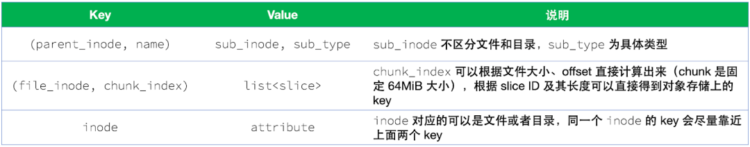上图是使用 KV 存储(比如 TiKV)作为 JuiceFS 元数据引擎时的数据结构设计,如果对比 Tectonic 的设计,既有相似之处也有一些大的差异。比如第一个 key,在 JuiceFS 的设计里没有对文件和目录进行区分,同时文件或目录的属性信息也没有放在 value 里,而是有一个单独的 key 用于存储属性信息(即第三个 key)。