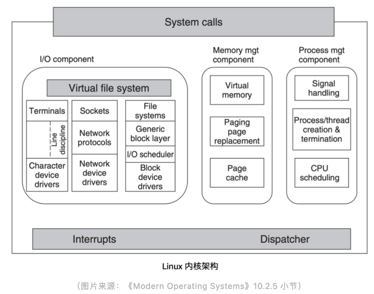 上图是 Linux 内核的架构,左边 Virtual file system 区域,也就是虚拟文件系统简称 VFS。它的作用是为了帮助 Linux 去适配不同的文件系统而设计的,VFS 提供了通用的文件系统接口,不同的文件系统实现需要去适配这些接口。