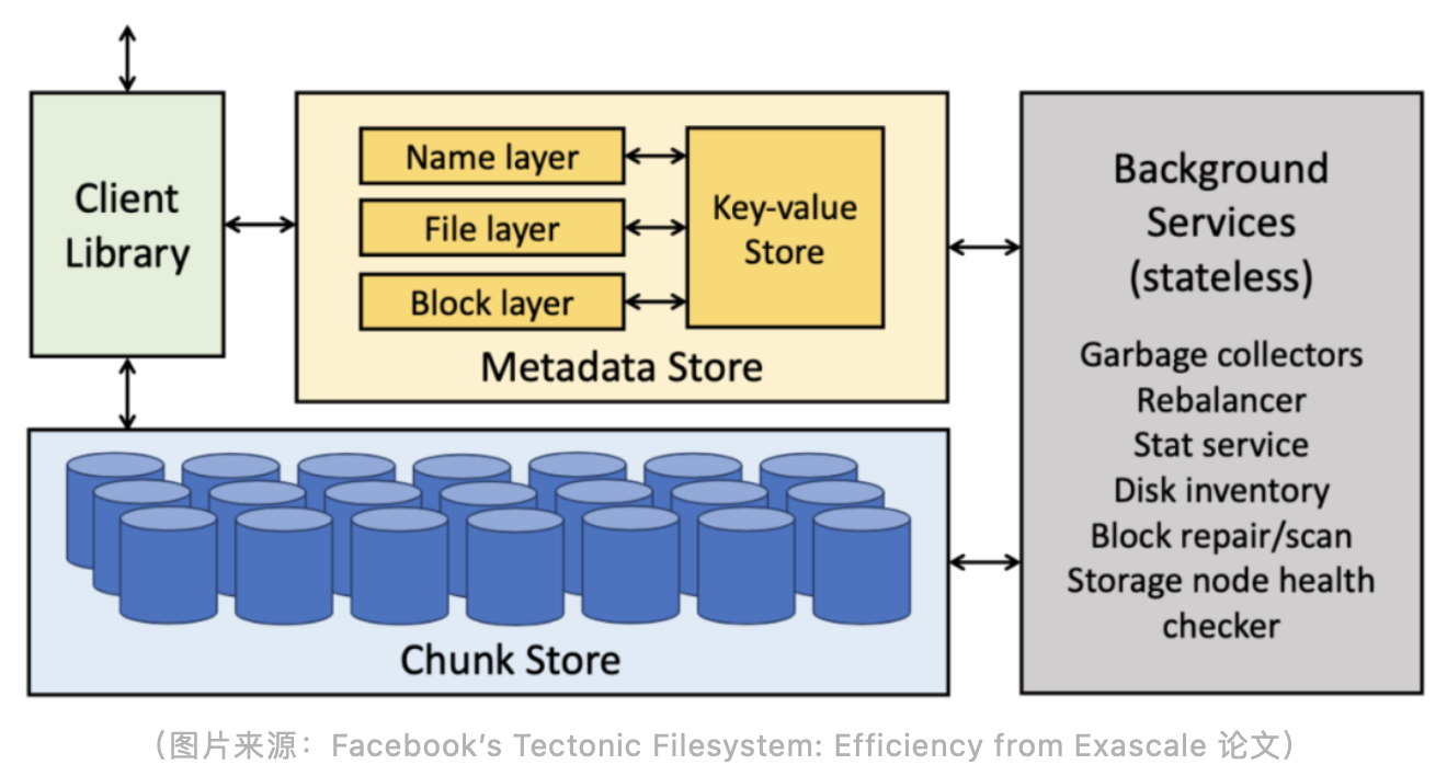 这里不得不提一下,GFS 的下一代产品: Colossus。由于 GFS 的架构设计存在明显的扩展性问题,所以 Google 内部基于 GFS 继续研发了 Colossus。Colossus 不仅为谷歌内部各种产品提供存储能力,还作为谷歌云服务的存储底座开放给公众使用。Colossus 在设计上增强了存储的可扩展性,提高了可用性,以处理大规模增长的数据需求。下面即将介绍的 Tectonic 也是对标 Colossus 的存储系统。篇幅关系,这篇博客不再展开介绍 Colossus,有兴趣的朋友可以阅读官方博客。