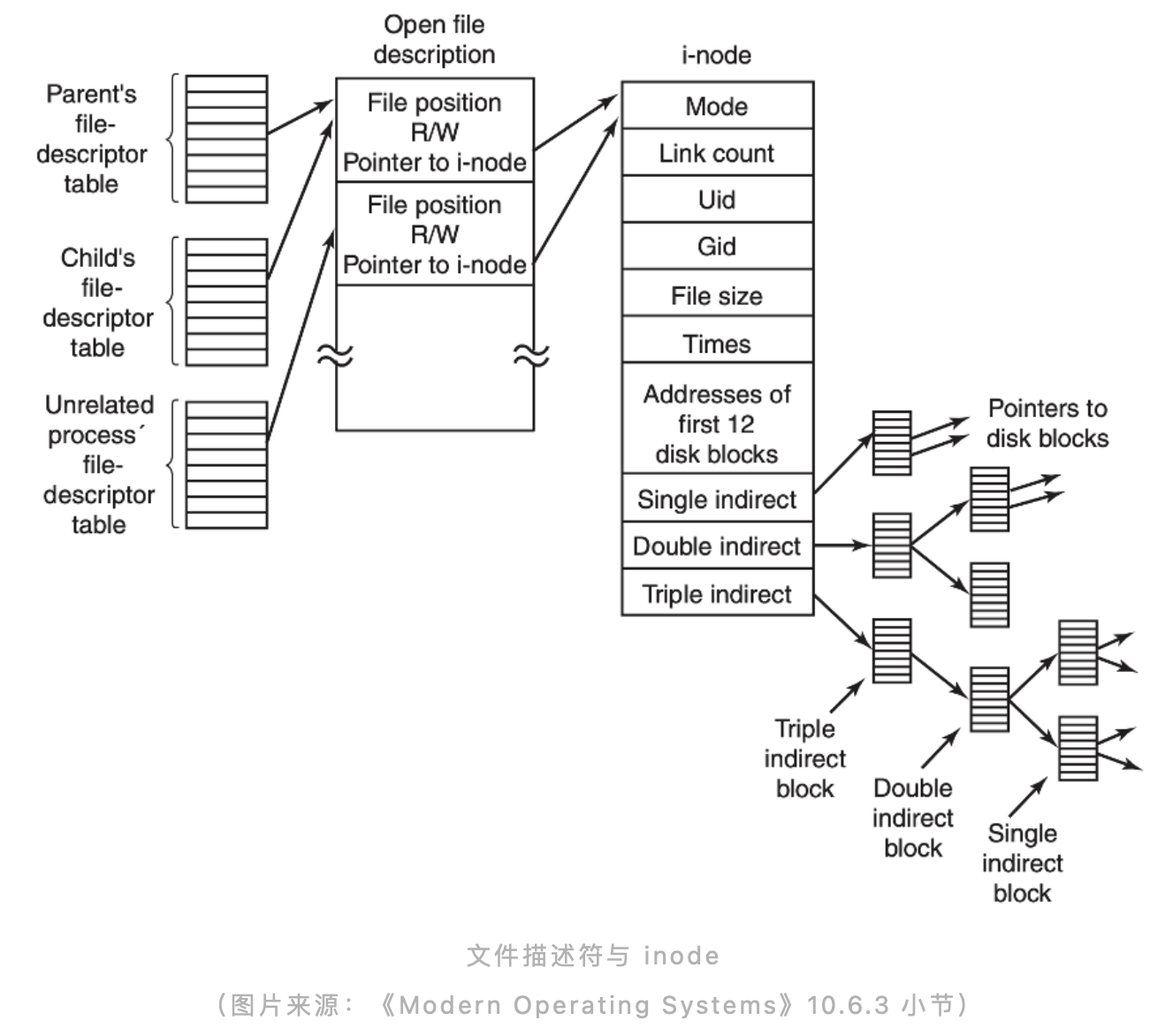 最右边的 inode 就是每个文件系统内部的数据结构。这个 inode 有可能是一个目录,也有可能是一个普通的文件。 Inode 里面会包含关于文件的一些元信息,比如创建时间、创建者、属于哪个组以及权限信息、文件大小等。此外每个 inode 里面还会有一些指针或者索引指向实际物理存储介质上的数据块。