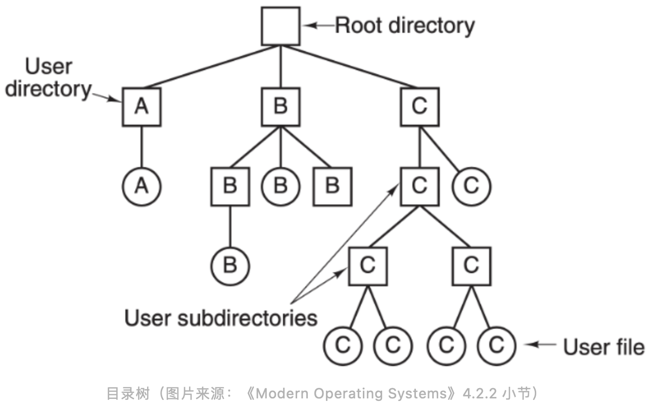 上图是一个目录树的结构,在文件系统里面,所有数据的组织形式都是这样一棵树的结构,从最上面的根节点往下,有不同的目录和不同的文件。这颗树的深度是不确定的,相当于目录的深度是不确定的,是由每个用户来决定的,树的叶子节点就是每一个文件。