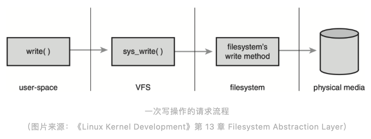 上图是一次写操作的请求流程,在 Linux 里写文件,其实就是一次 write() 系统调用。当你调用 write() 操作请求的时候,它会先到达 VFS,再由 VFS 去调用文件系统,最后再由文件系统去把实际的数据写到本地的存储介质。