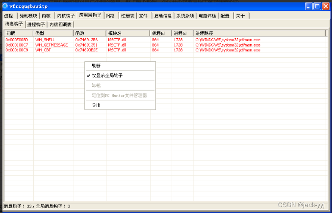 简单地说就是拦截各种系统命令的动作,比如我们右击删除一个文件,那么就会给系统发出一个“我要删除这个文件”的命令。收到后windows再转给系统中专门负责删除职能的那个人,由他去具体执行,而如果病毒采用了钩子,则会监视这些操作,将所有命令先经过自己手。如果发现删除命令的对象是自己,那么就把这个命令抛弃掉,如果是其他的就继续交给那个人来执行。就有点类似于奸臣扣留所有对自己不利的奏章,欺上瞒下那种。不过并不是所有钩子都是病毒的杰作,安全软件基本都有的,如何辨别就需要对文件名字有一定了解或上网搜索下。