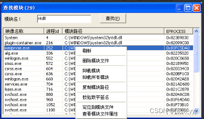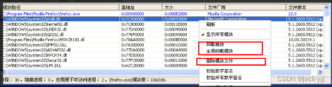 这三种方式分别代表将这个模块文件从该进程里除掉、将这个模块文件从所有进程里除掉、直接删除了这个文件(如果认定是病毒木马就可以采取后两个措施),不过实际操作中需要判断准确,因为如果错误卸载了正常安全的模块可能会引起系统崩溃,死机等等。而右击模块文件弹出的菜单里校验数字签名、查看模块文件属性等等都有助于判断。