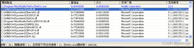 当我选择firefox.exe时有106个模块,其中12个不是微软出品的,一个进程中包含了而很多模块文件是很正常的事,如果要想辨别出病毒程序就比较麻烦了,需要一定的系统知识和了解。