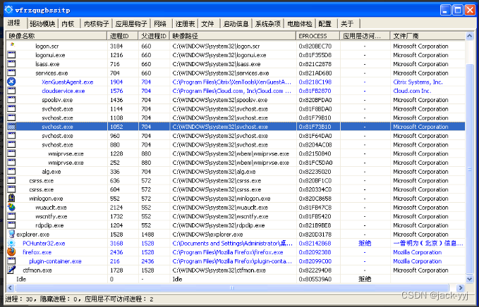 (6)应用层的访问状态:说明这个进程是否允许其它进程对自己操作,比如关闭自己,一般的杀毒软件有自我保护,会禁止其它进程对自己有任何操作。