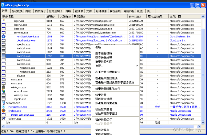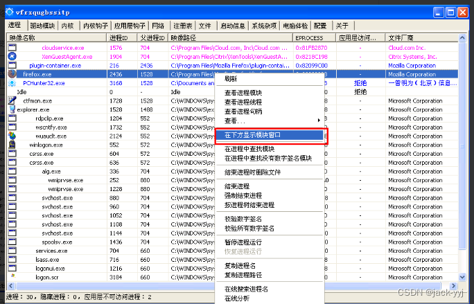(5)进程标签下,当下方使用模块窗口时,对文件厂商是微软的进程,会检测其所有模块,如果有模块是非微软的 ---->土黄色