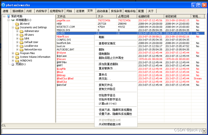 文件管理器,这在小菜们手工杀毒方面也是非常重要必备的,这里可以像在我的电脑或者资源管理器那样操作文件,不过他更加强大实用,可以查看此盘里面所有的文件和文件夹,不管是否被隐藏,右击某个文件弹出的菜单也非常强大,一些正常情况下不能被删除修改的文件在这里都能轻松被消灭。