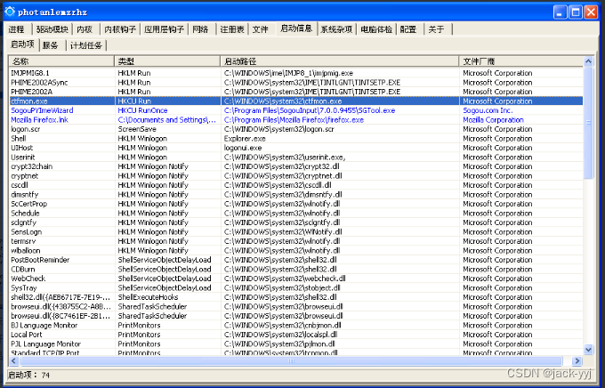 这里分别显示了一些会自动运行的程序位置名称,等等,第二项的类型则是启动的方式,有注册表启动,也有在启动文件夹里实现开机启动的,等等。和前面查看进程一样,黑色是被认为安全的微软公司出品文件,蓝色则是其他软件公司或个人的作品。