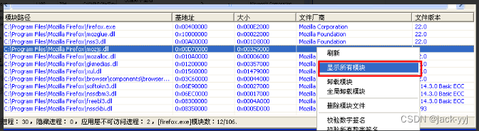 默认中显示的并不完全,右击选择显示所有模块可以查看到那些微软出品的,软件自认为是安全的模块文件。