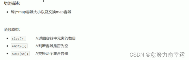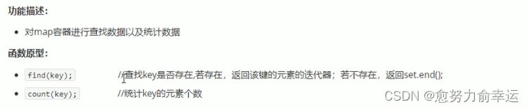 {//查找mapm;m.insert(pair(1, 10));m.insert(pair(2, 20));m.insert(pair(3, 30));m.insert(pair(3, 40));//map不允许有重复的key,所以这一个数据插不进去map::iterator pos=m.find(3);//不管查没查到都会返回一个迭代器if (pos != m.end()){cout << "查到了元素 key = " << pos->first<<" value = " << (*pos).second << endl;}else{//找不到返回m.end()cout << "未找到元素" << endl;}//统计//map不允许有重复的key,count统计而言,要么是1要么是0//multimap的count统计可能大于1int num = m.count(3);cout << "num = " << num << endl;