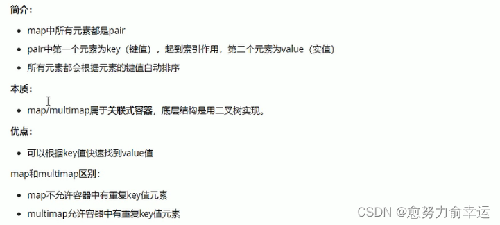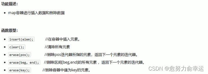 {mapm;//插入//第一种m.insert(pair(1, 10));//第二种m.insert(make_pair(2, 20));//第三种m.insert(map::value_type(3, 30));//第四种//m[4]不存在会创建,存在会覆盖原值,//另外一个,没有key为5的pair,输出m[5]时,value的值会赋0m[4] = 40;m.insert({ 55,50 });printMap(m);//[]通过key访问valuecout << m[4] << endl;//删除map::iterator it = m.begin();m.erase(++it); //it + 1报错,不可以随机删除,前移后移可以printMap(m);//key删除m.erase(55);//按照key删除 ,key存在就删除,不存在就不删除m.erase(10);printMap(m);//区间删除m.erase(m.begin(), ++m.begin());printMap(m);//清空m.clear();