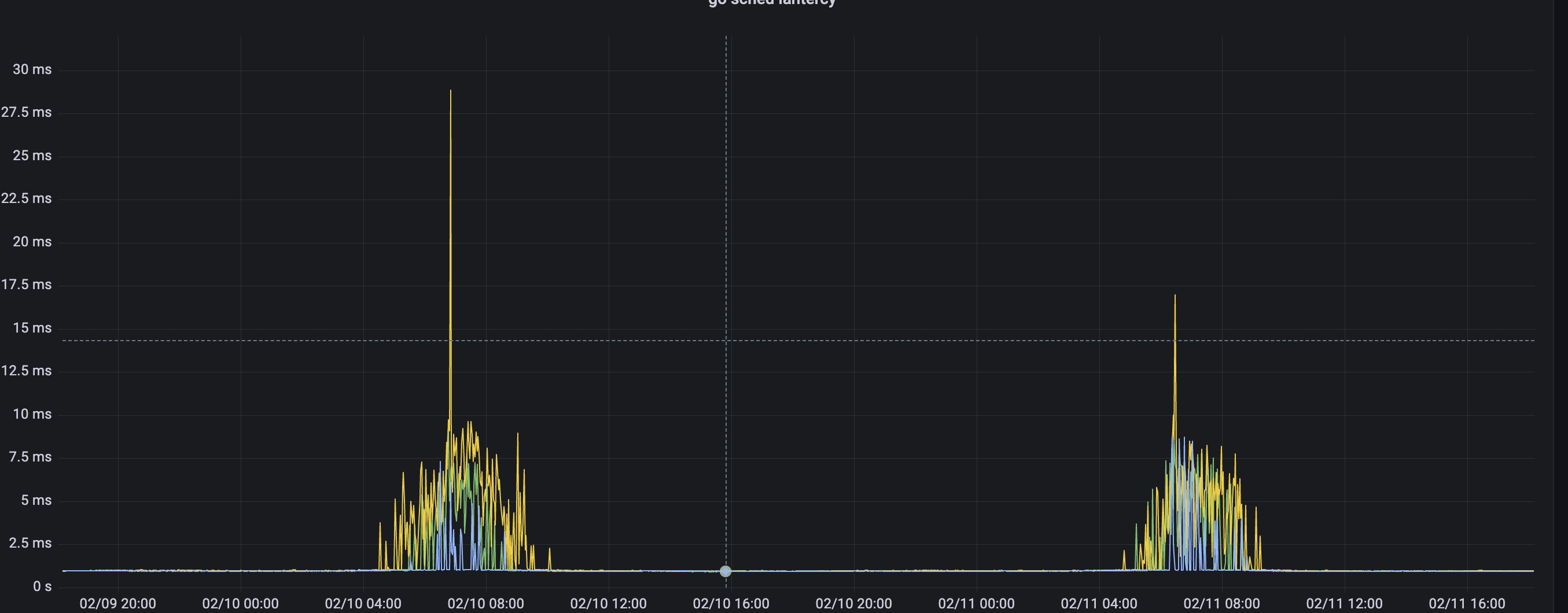 将这个信息展示在grafana里。于是有了第二天协程调度延迟的信息。p999在业务高峰期间达到了100ms,也是与超时时间吻合的。协程调度延迟指的是协程变为可运行状态后到被真正执行这段时间等待被调度的时间,这里都高达100ms了,如果加上cpu线程,进程切换上下文时间,很有可能是超过了redis client端设置的200ms超时上限。