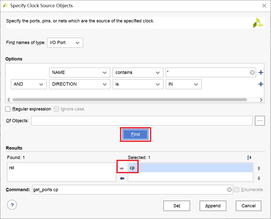 【d】在Specify Clock Source Object中Find names of type选择I/O Ports后点击Find,并将查找到的cp选中,如图: