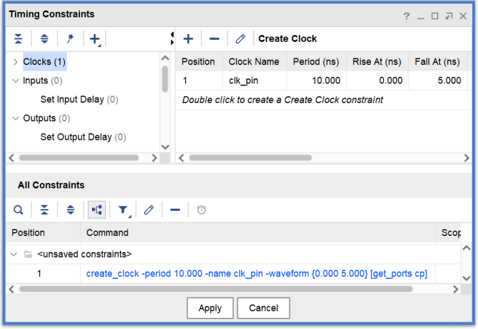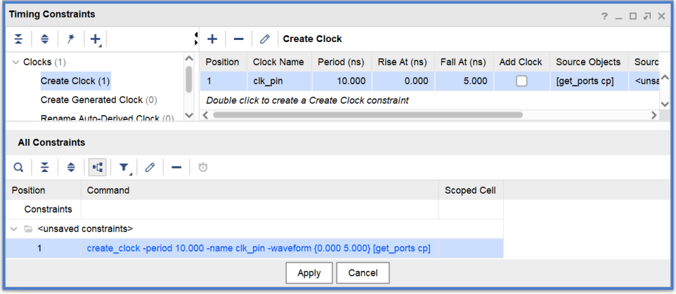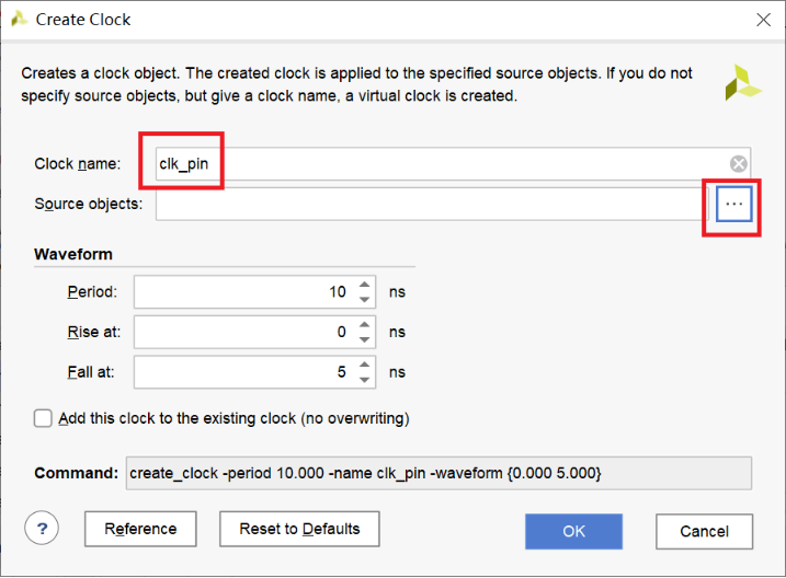 【c】双击左边Clock->Create Clock,进入Create Clock界面,在Clock name中输入clk_pin。在Source objects中选择右边的按钮。
