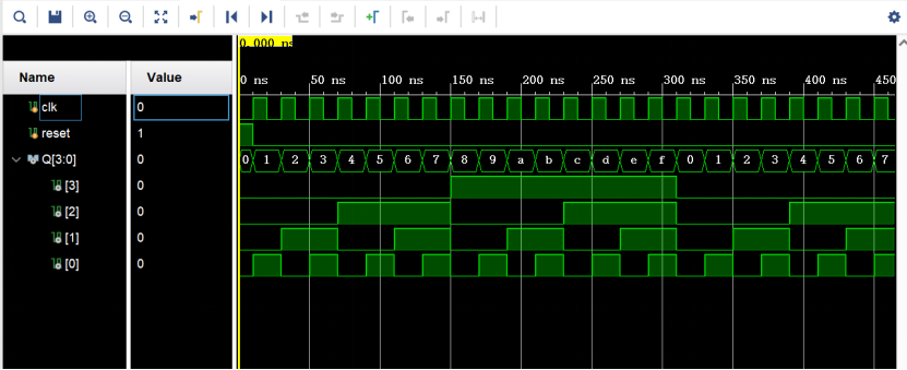 module slowClock(clk, reset,Q);input clk, reset;output [3:0] Q;reg [3:0] Q = 4'b0000;// provide initial condition for this register.reg [27:0] counter;// counter size calculation according to input and output frequencies