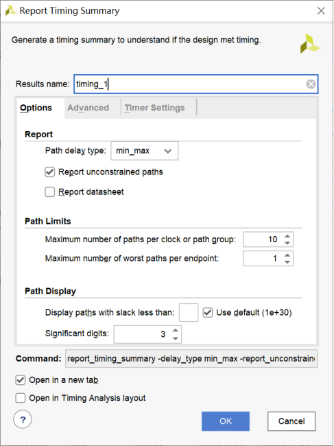 【i】在Flow Navigator中选择Synthesized Design ->Report Timing Summary。并将Options标签里将Path delay type设置成min_max。