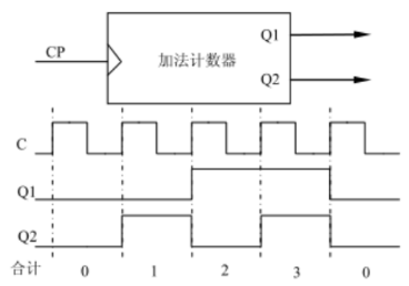 [ii] 如果将Q0、Q1作为单独信号线引出,由Q0、Q1得到的波形频率是时钟脉冲信号clk的1/2、1/4,亦即是将时钟脉冲信号的clk频率除2、除4。因此图示计数器又常被称为除4计数器。