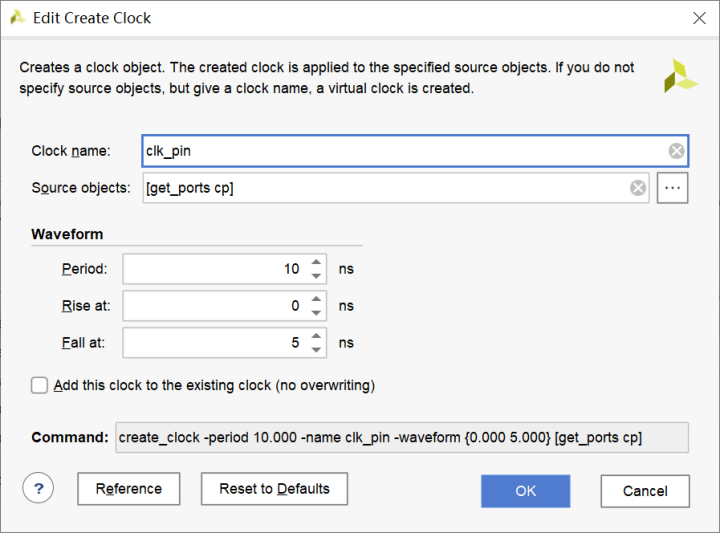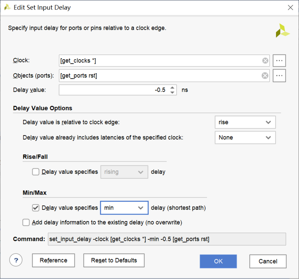 将Clock选择为clk_pin、Objects选择rst、Delays value选择-0.5 ns、并选中Delay value specifies,