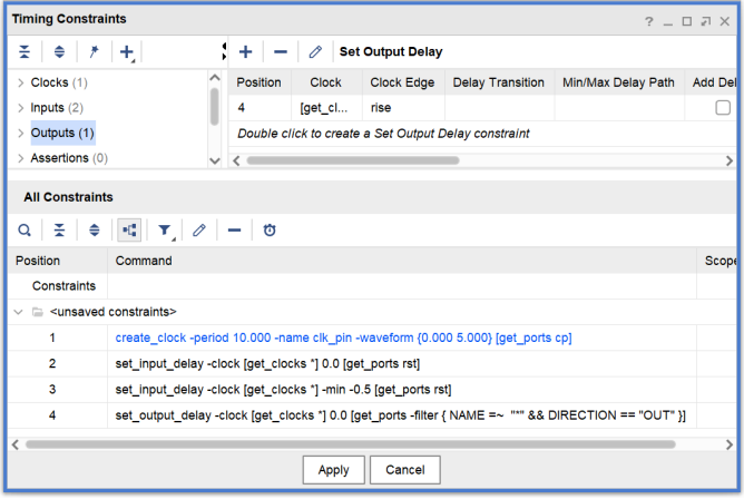 【g】接下来设置Output Delay,双击左边Output->Set Output Delay。Clock选择clk_pin、Objects选择所有输出,Delay value设置为0ns。