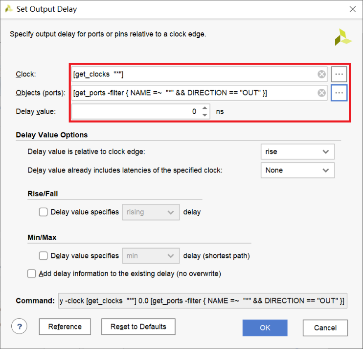 进入Set Input Delay,按照下图配置:Clock选择clk_pin,Objects选择rst,Delay选择0 ns。完成设置后点击OK。