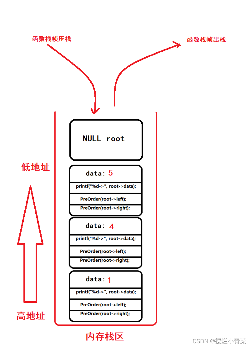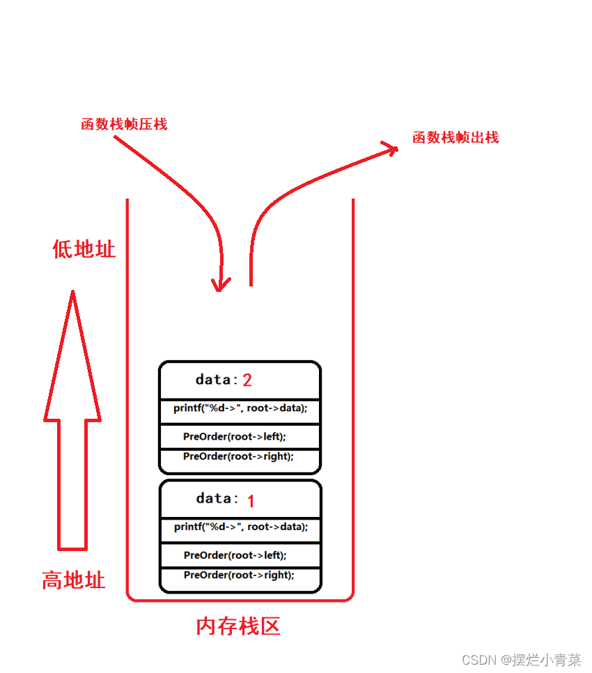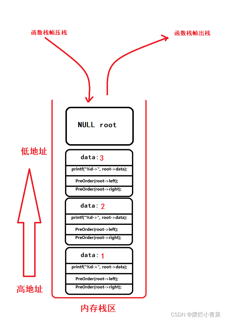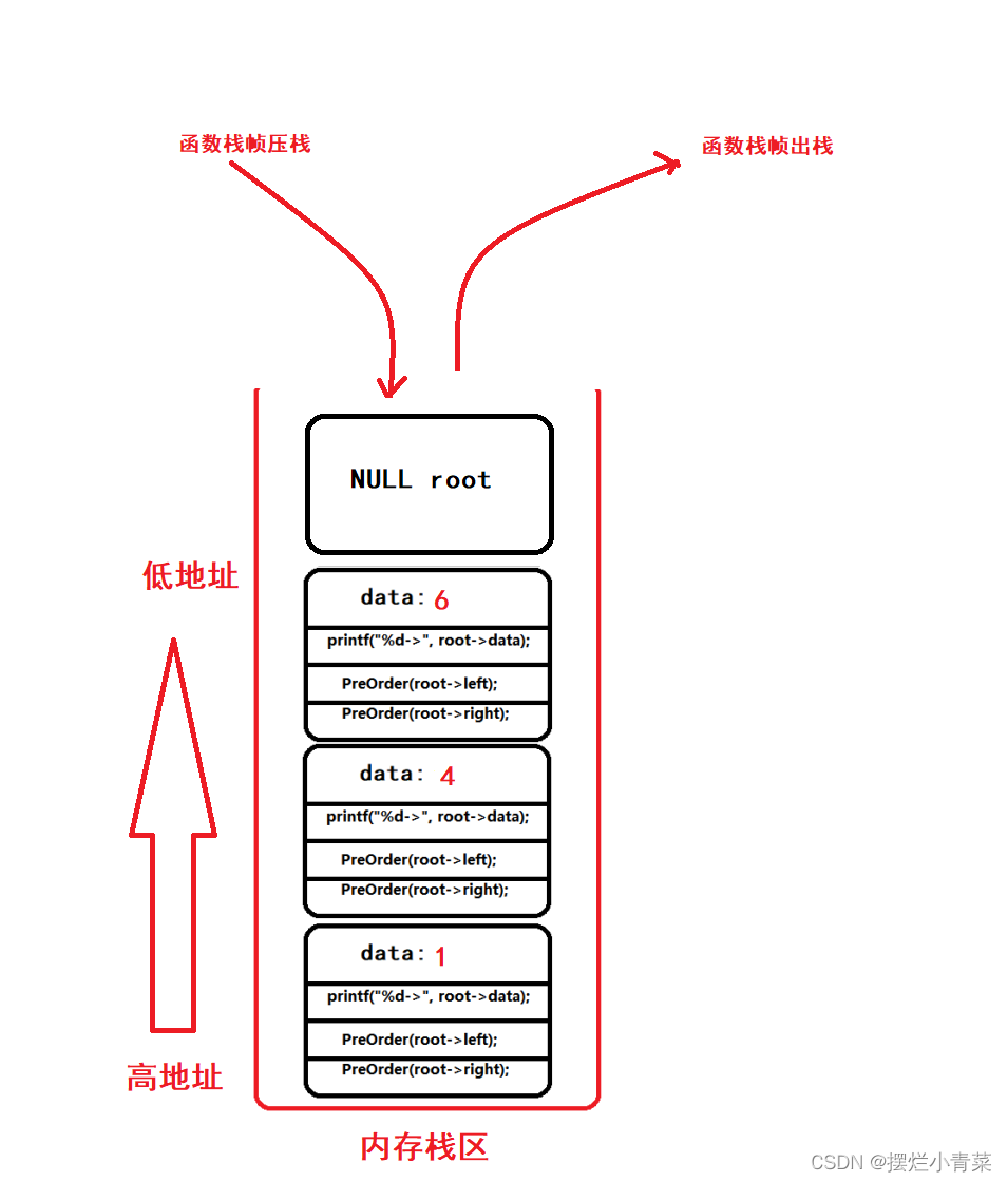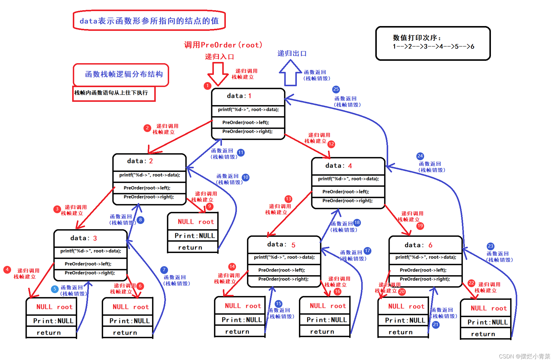 PreOrder(root); //root为树根地址递归函数执行过程中函数栈帧的逻辑结构分布以及代码语句执行次序图示: