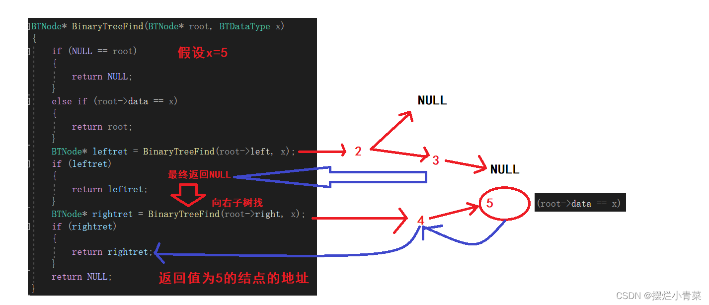 BTNode* BinaryTreeFind(BTNode* root, BTDataType x) {//寻找到空树则返回空(说明在某条连通路径上不存在待找结点)if (NULL == root){return NULL;}//判断树根是否为待找结点,若判断为真则返回该结点地址else if (root->data == x){return root;}//若树根不是要找的结点, 则往左子树找BTNode* leftret = BinaryTreeFind(root->left, x);if (leftret){return leftret;}//若左子树中不存在待找结点,则往右子树找BTNode* rightret = BinaryTreeFind(root->right, x);if (rightret){return rightret;}//若左右子树中都找不到则说明不存在待找结点,返回空return NULL; }将下图中的树的根结点地址传入递归函数: