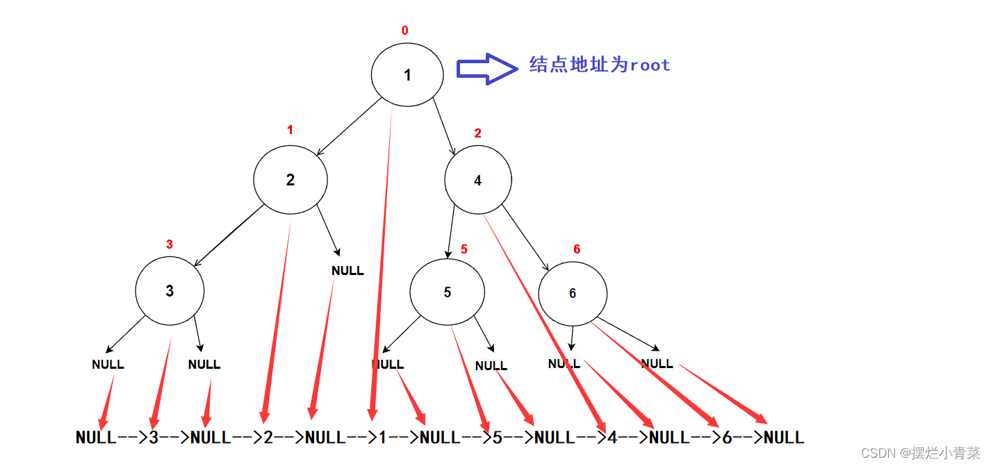 //二叉树中序遍历 void InOrder(BTNode* root) {if (NULL == root){printf("NULL->"); //为了方便观察我们打印出空结点return;}InOrder(root->left); //向左子树递归printf("%d->", root->data); //打印结点值(root处理语句)InOrder(root->right); //向右子树递归 }