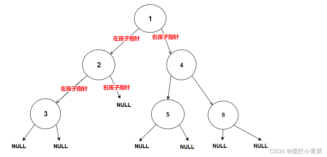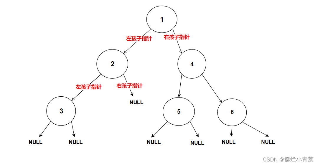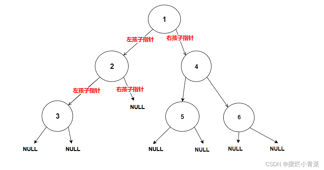 //在内存堆区上申请结点的接口 BTNode* BuyNode( BTDataType x) {BTNode* tem = (BTNode*)malloc(sizeof(BTNode));assert(tem);tem->data = x;tem->left = NULL;tem->right = NULL;return tem; }int main () {BTNode* node1 = BuyNode(1);BTNode* node2 = BuyNode(2);BTNode* node3 = BuyNode(3);BTNode* node4 = BuyNode(4);BTNode* node5 = BuyNode(5);BTNode* node6 = BuyNode(6);node1->left = node2;node1->right = node4;node2->left = node3;node4->left = node5;node4->right = node6;//其他操作return 0; }树的逻辑结构图示: