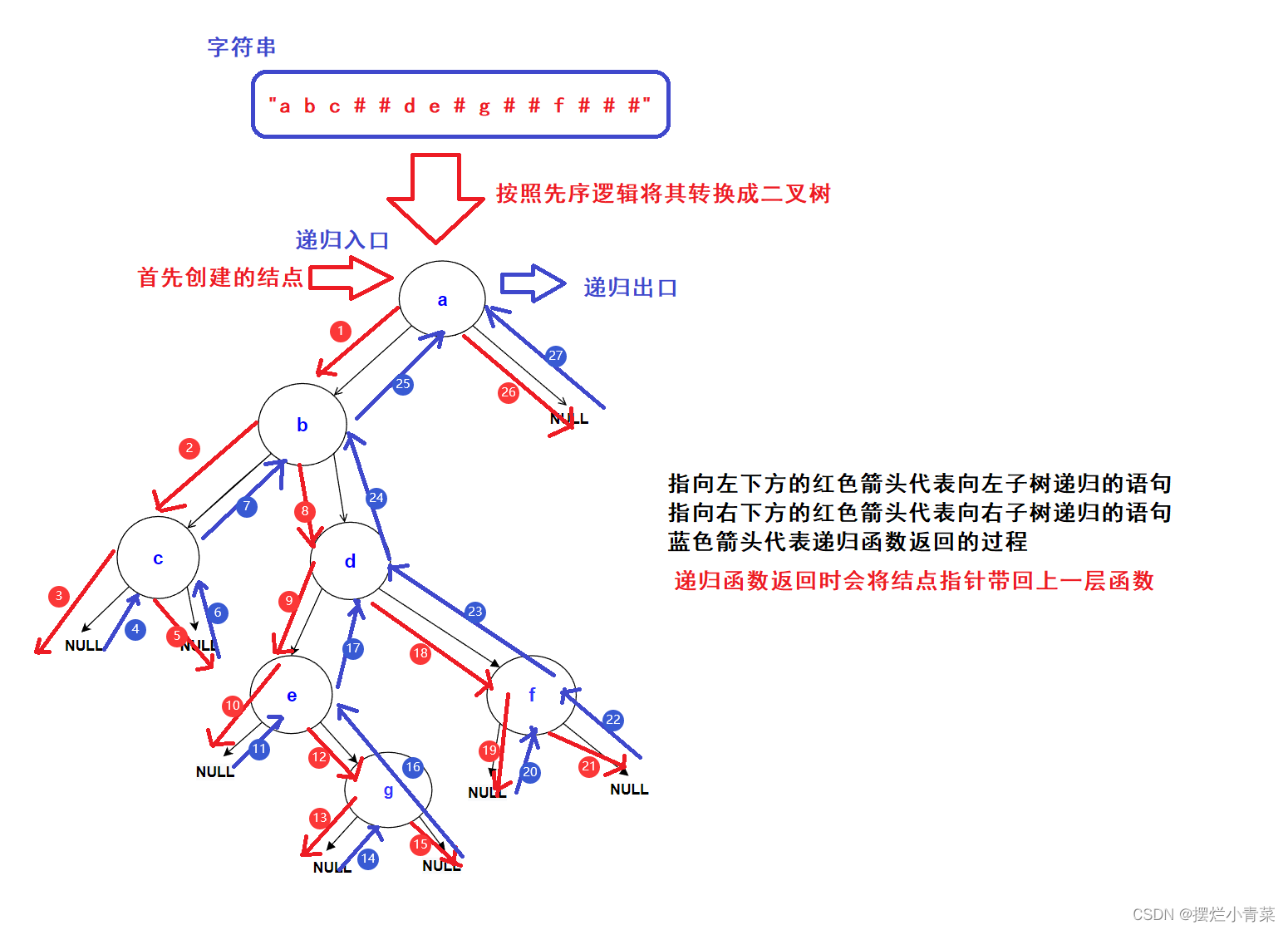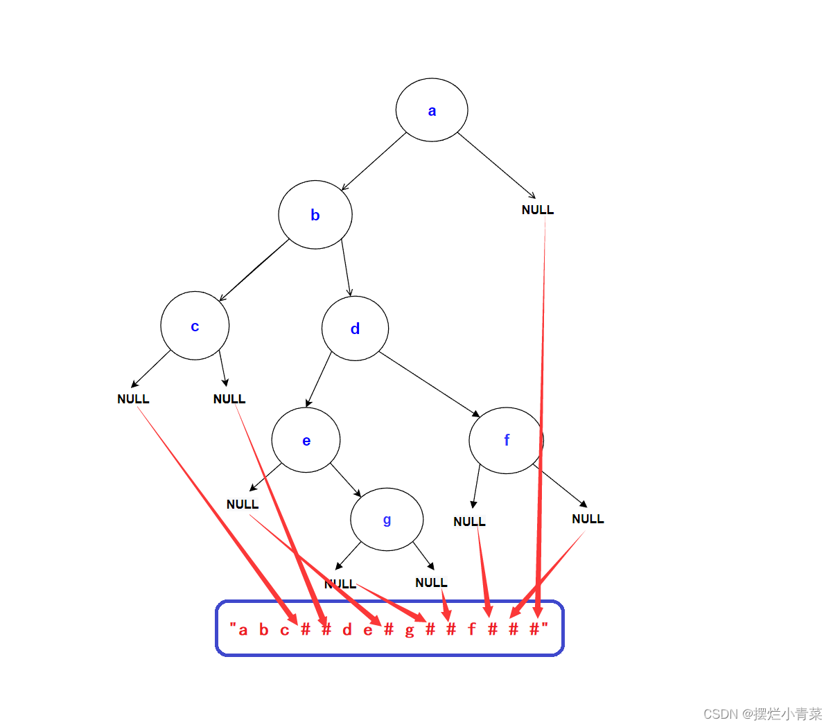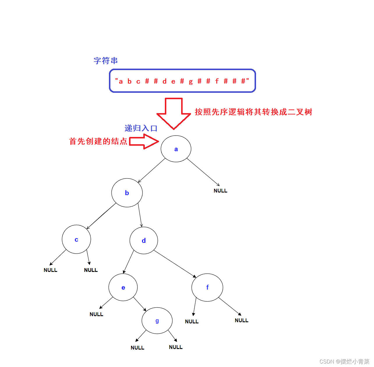 - 进一步分析可知:给定的字符串序列必须满足二叉树的前序序列逻辑,不然该字符串序列便无法被转换成一颗完整的二叉树