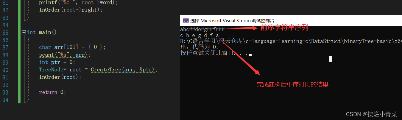 #include#include using namespace std;struct TreeNode //树结点结构体 {char word;TreeNode * left;TreeNode * right; };//ptr是字符串数组下标的地址,这里一定要传址,因为我们要在不同的函数栈帧中修改同一个字符数组下标变量 TreeNode * CreateTree(char * input,int* ptr) {if('#'==input[*ptr]) //#代表空树,直接将空指针返回给上层结点即可{++*ptr;return nullptr;}TreeNode * root = new TreeNode; //申请新结点root->word = input[*ptr]; //结点赋值 ++*ptr; //字符数组下标加一处理下一个字符root->left = CreateTree(input,ptr); //向左子树递归root->right = CreateTree(input,ptr);//向右子树递归return root; //将本层 }void InOrder(TreeNode * root) //中序遍历递归 {if(nullptr == root){return;}InOrder(root->left);printf("%c ",root->word);InOrder(root->right); }int main() {char arr[101] = {0};scanf("%s",arr);int ptr = 0;TreeNode * root = CreateTree(arr,&ptr);InOrder(root);return 0; }