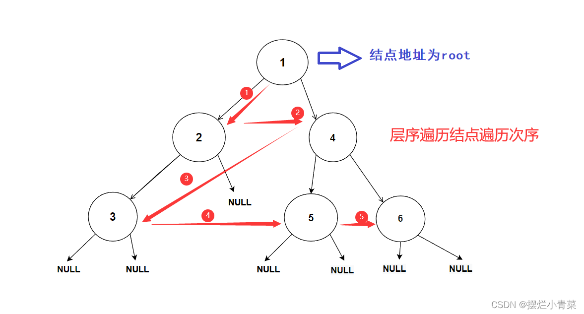- 创建一个队列,将树的根结点地址插入队列中;(队列中的数据先进先出,数据从队尾入队从队头出队)