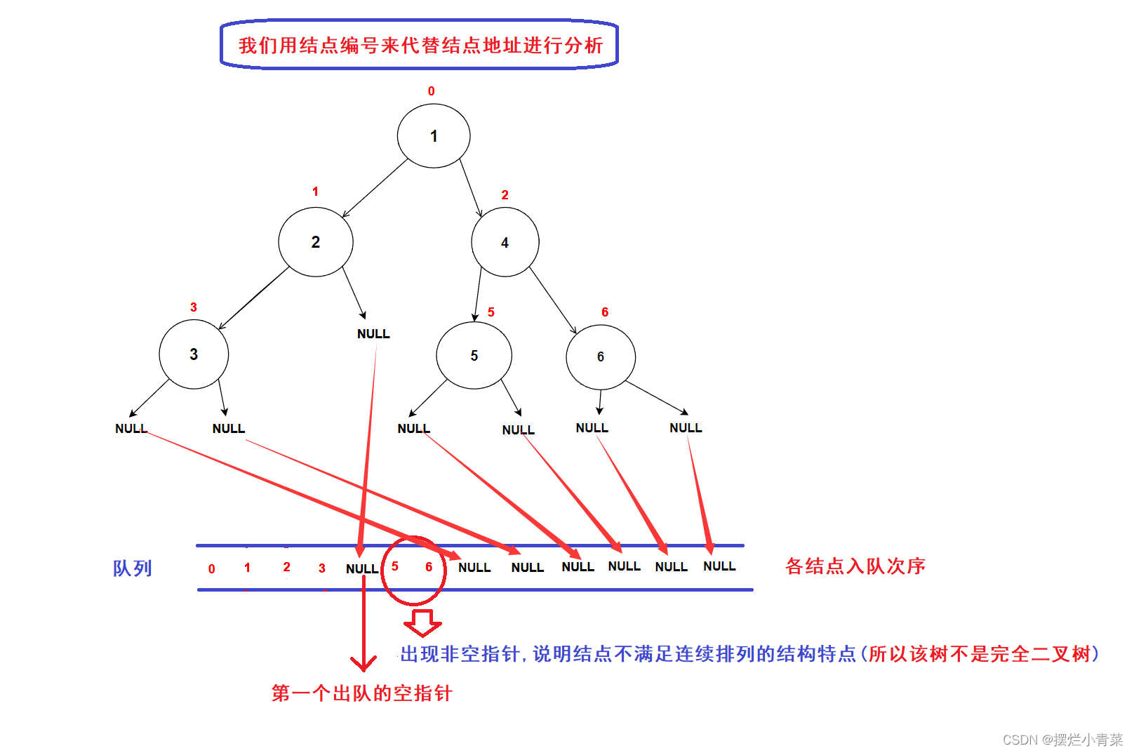 - 根据完全二叉树的结构特点,一旦层序遍历完全二叉树的过程中遍历到了空指针,则说明已经遍历到了二叉树的最后一层