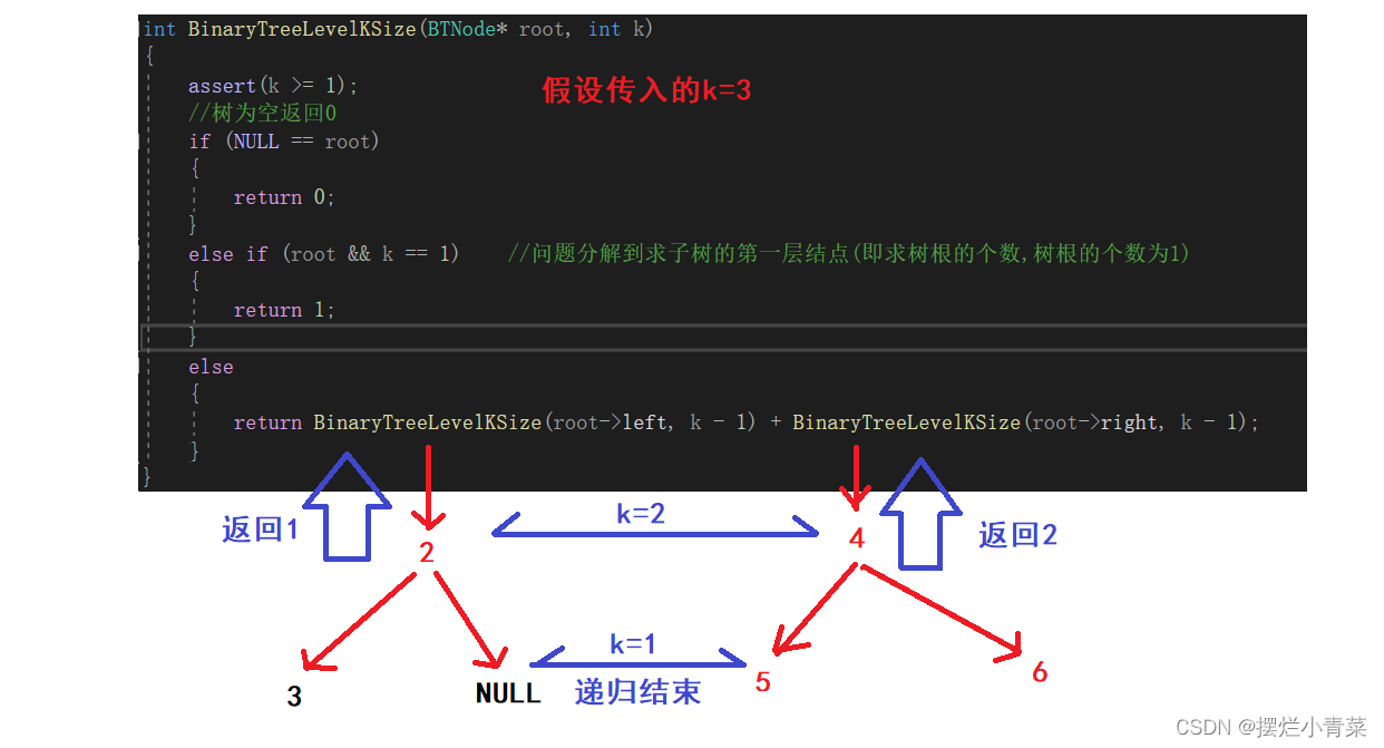 int BinaryTreeLevelKSize(BTNode* root, int k) {assert(k >= 1);//树为空返回0if (NULL == root){return 0;}else if (root && k == 1) //问题分解到求子树的第一层结点(即求树根的个数,树根的个数为1){return 1;}else{return BinaryTreeLevelKSize(root->left, k - 1) + BinaryTreeLevelKSize(root->right, k - 1);} }将下图中的树的根结点地址传入递归函数: