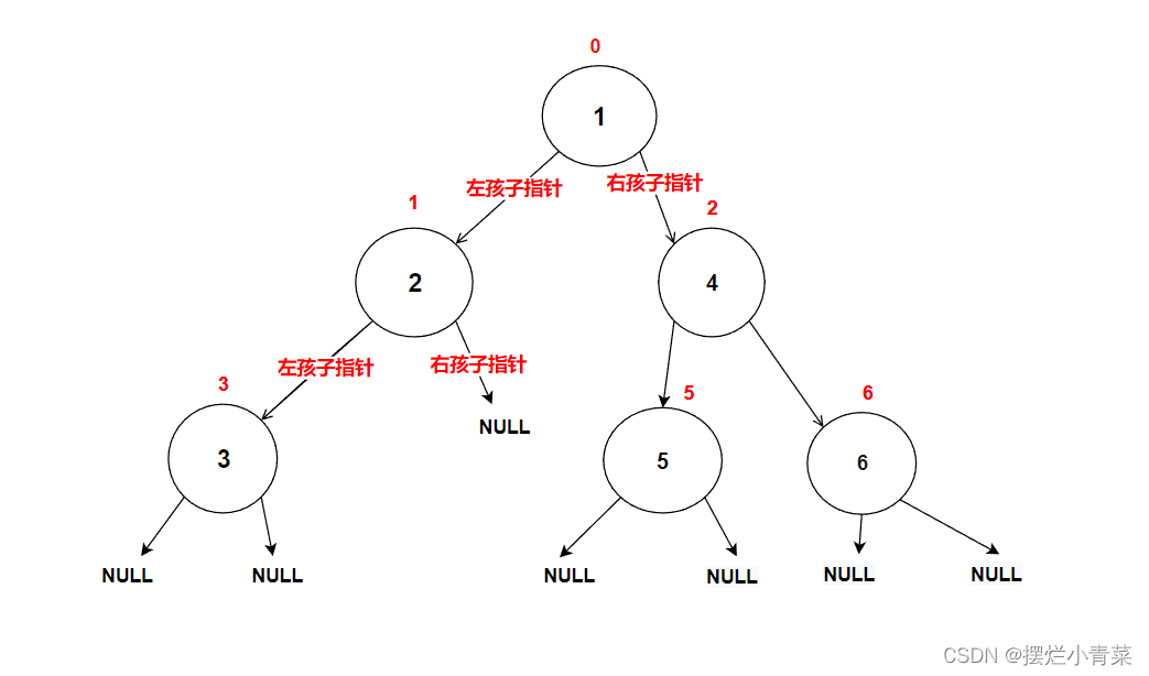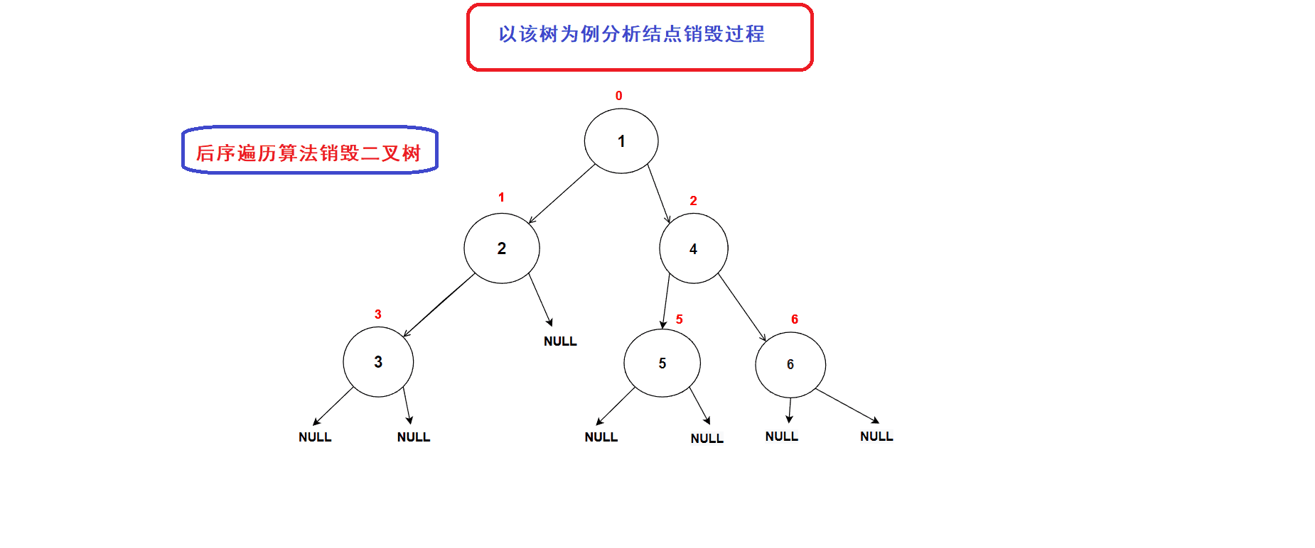 // 二叉树销毁 void BinaryTreeDestory(BTNode* root) {if (NULL == root){return;}BinaryTreeDestory(root->left);BinaryTreeDestory(root->right);free(root); //释放到当前结点的内存空间}二叉树销毁过程图示: