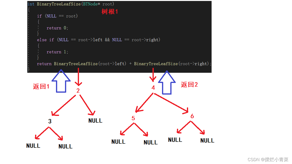 int BinaryTreeLeafSize(BTNode* root) {if (NULL == root) //空树不计入个数{return 0;}else if (NULL == root->left && NULL == root->right) //判断当前树是否为树叶(是树叶则返回1,计入叶子结点个数){return 1;}//化为子问题进行分治return BinaryTreeLeafSize(root->left) + BinaryTreeLeafSize(root->right); }将下图中的树的根结点地址传入递归函数: