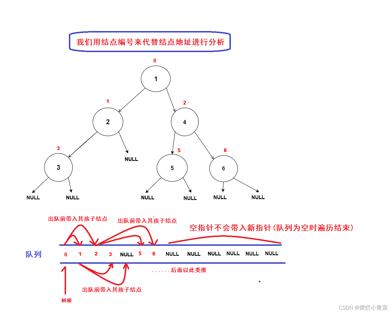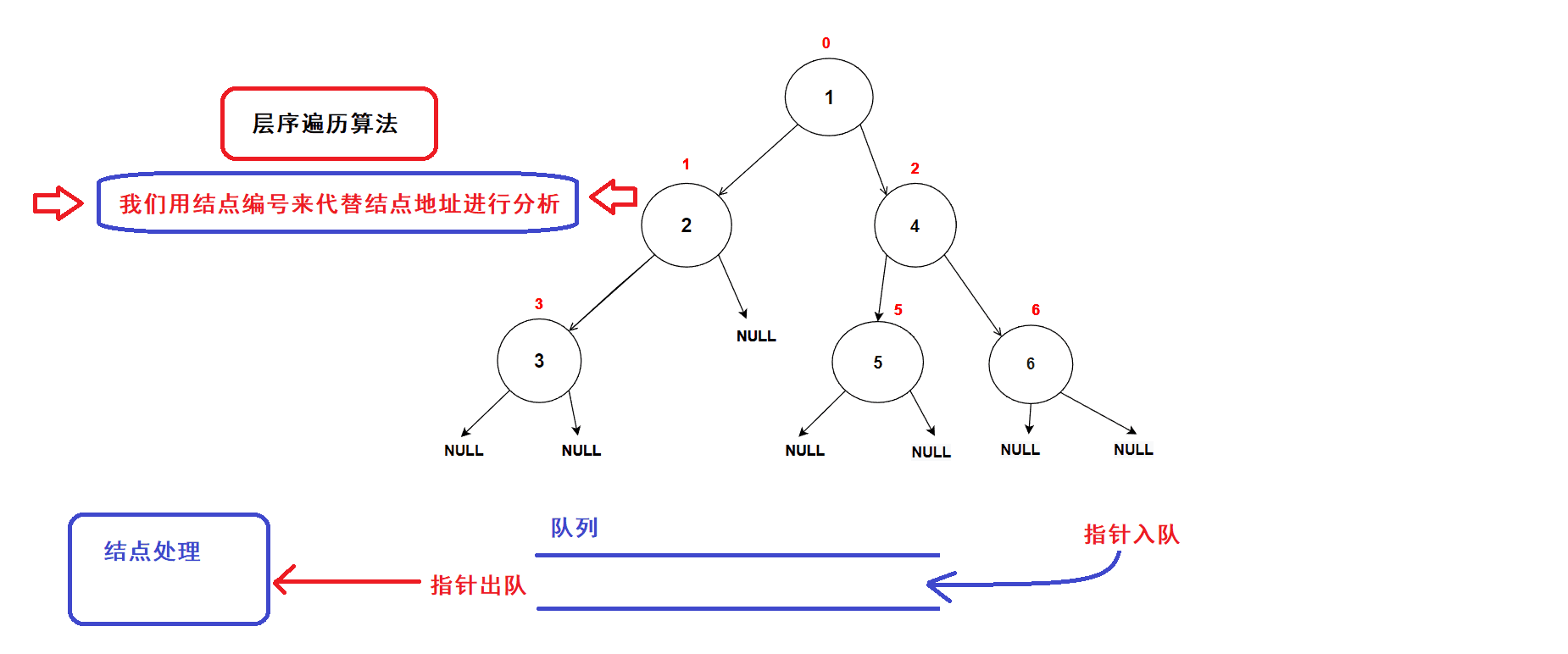 - 经过分析可知:队列中的树结点地址就是按照树结点的层序逻辑顺序进行排列的(从根结点开始,前一层结点指针出队后会带入下一层结点的指针),因此该算法可以完成二叉树的层序遍历