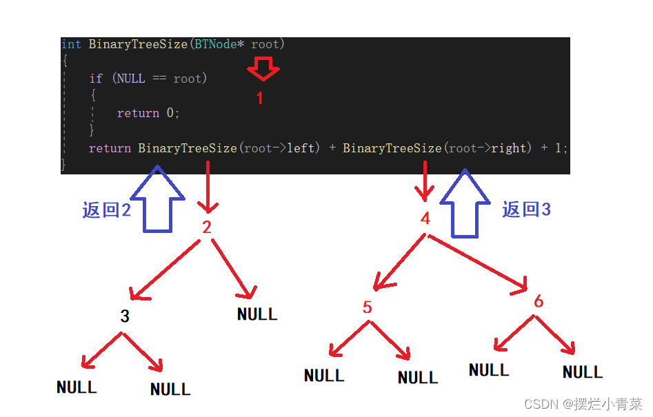 int BinaryTreeSize(BTNode* root) {//空树则返回0if (NULL == root){return 0;}//化为子问题进行分治return BinaryTreeSize(root->left) + BinaryTreeSize(root->right) + 1; }将下图中的树的根结点地址传入递归函数: