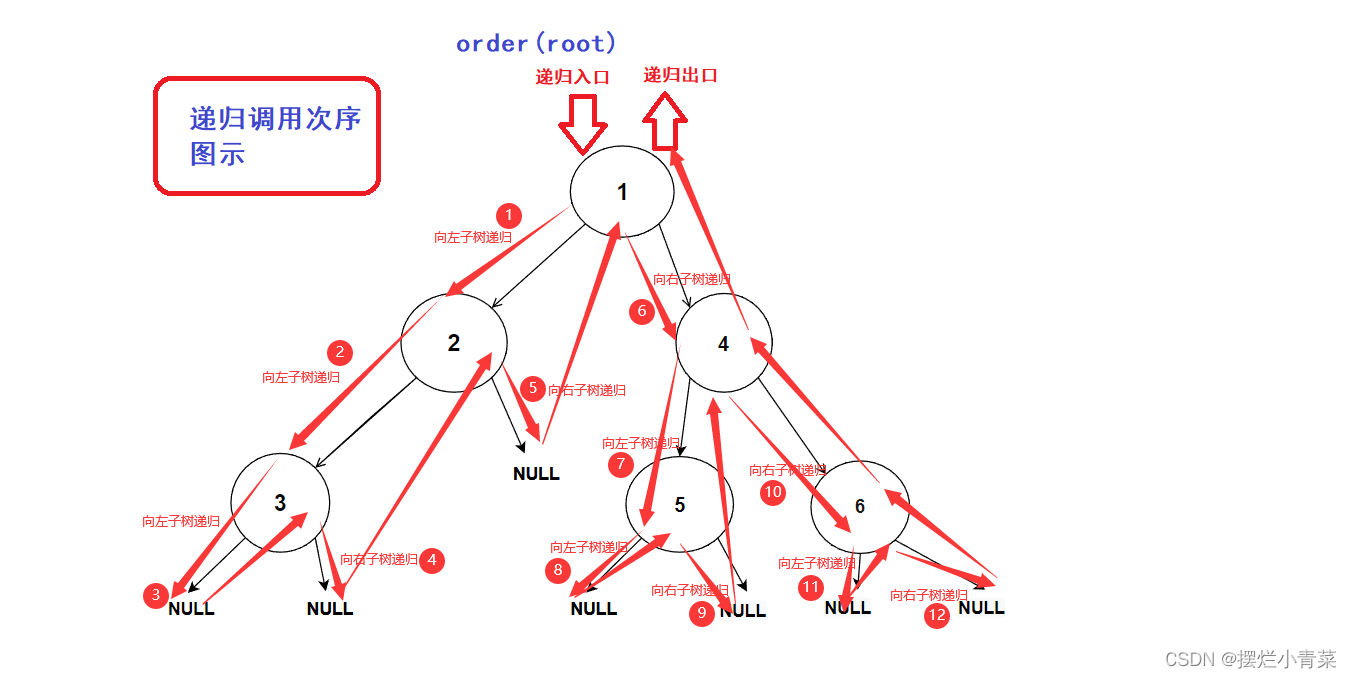 //递归遍历二叉树的基本函数结构 void Order(BTNode* root) {if (NULL == root){return;}对当前结点进行某种处理的语句位置1(前序);Order(root->left); //遍历左子树的递归语句对当前结点进行某种处理的语句位置2(中序);Order(root->right); //遍历右子树的递归语句对当前结点进行某种处理的语句位置3(后序); }