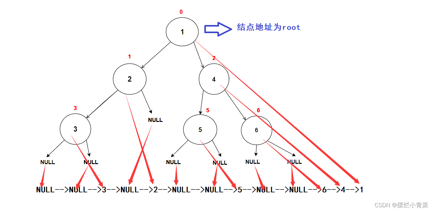 //二叉树后序遍历 void BackOrder(BTNode* root) {if (NULL == root){printf("NULL->"); //为了方便观察我们打印出空结点return;}BackOrder(root->left); //向左子树递归BackOrder(root->right); //向右子树递归printf("%d->", root->data); //打印结点值(root处理语句) }