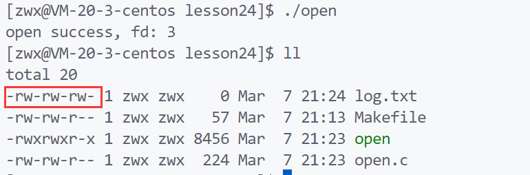 {umask(0);int fd = open("log.txt", O_WRONLY | O_CREAT, 0666);printf("open success, fd: %d\n", fd);return 0;