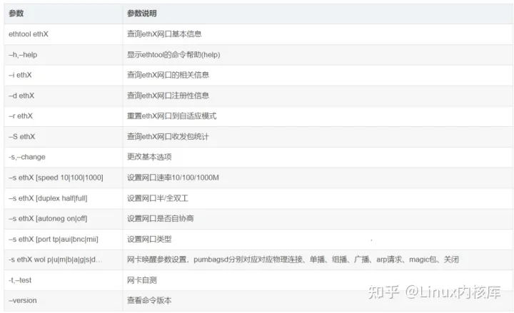 ethtool的参数有很多,下面只列举主要和常用的进行介绍,更多的详细说明可以通过–help帮助获取。另外虽然ethtool命令支持的功能很多,有些参数命令是需要网卡支持的。