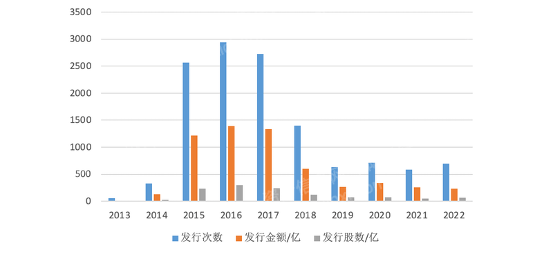 新三板的股票发行情况与上述类似,制造业发行数量最多,在2022年共发行431次,金额共133.73亿元,占所有行业发行量的57.6%,其他行业的发行量相对较少。在2015、2016、2017年达到峰值,但近几年却相对平稳。