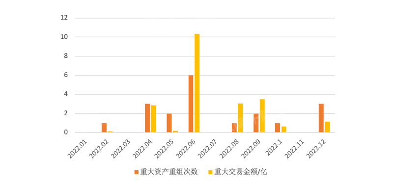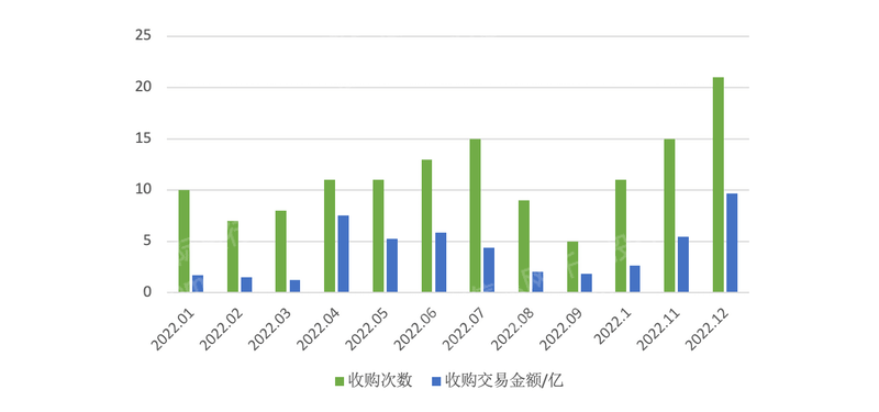 2022年全年共发生收购活动136次,收购交易金额共49.47亿元。整体收购行为集中在6月和12月前后。
