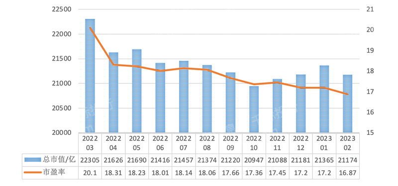 图 2022.3 - 2023.2新三板总市值及市盈率