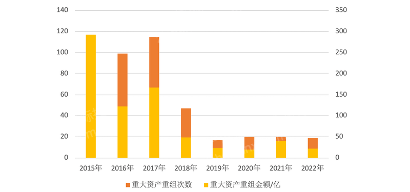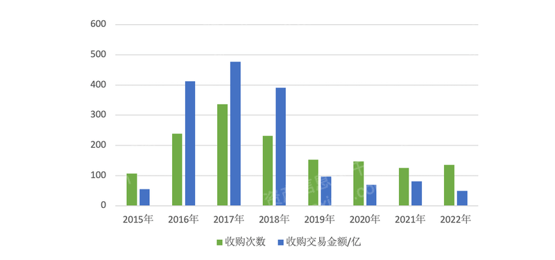 2015年至2022年期间,企业收购情况呈现类似的先增后减趋势,在2017年达到峰值,共发生336次收购活动,交易金额达到476.41亿元,2019年开始收购次数基本稳定在120次左右,交易金额稳定在70亿元左。2022年交易金额略有下降。
